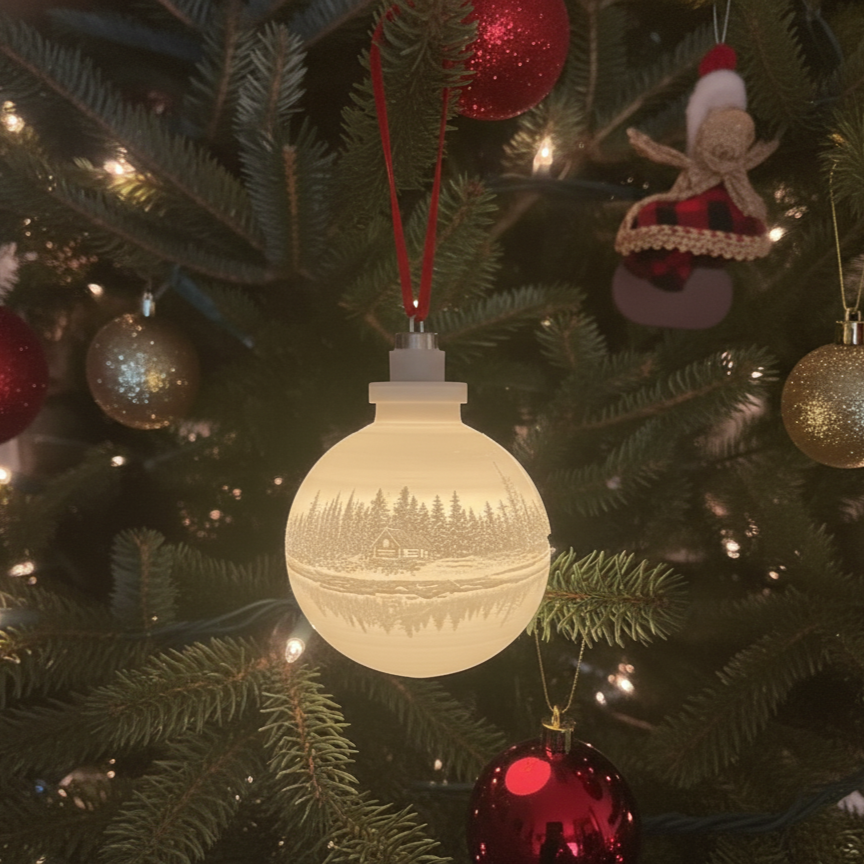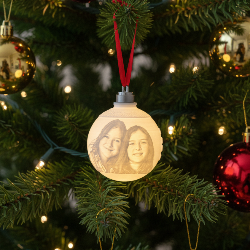 Uma luz que guarda memórias. As nossas bolas personalizadas revelam as suas fotos quando iluminadas, criando um brilho especial cheio de sentimento. Basta colocar na árvore e deixar que as lembranças deem vida à decoração — um toque de amor em cada luz.